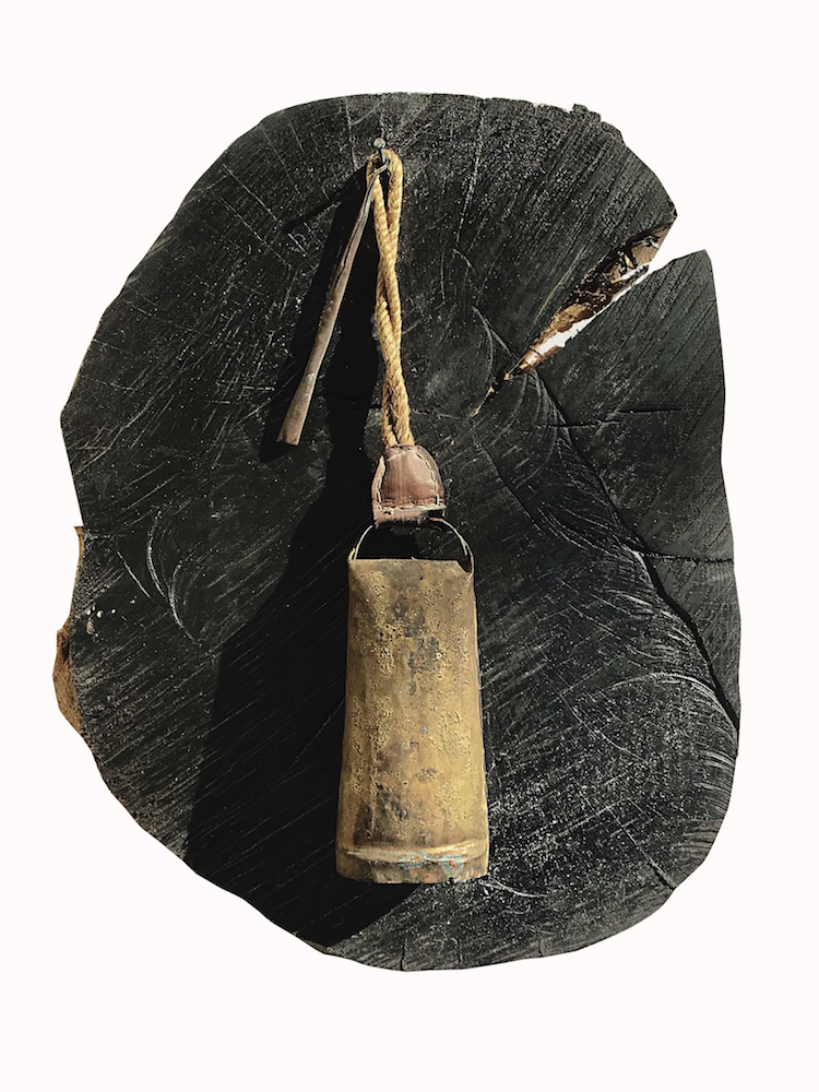 Sezione di albero, pittura ad olio, campana in ottone con corda.