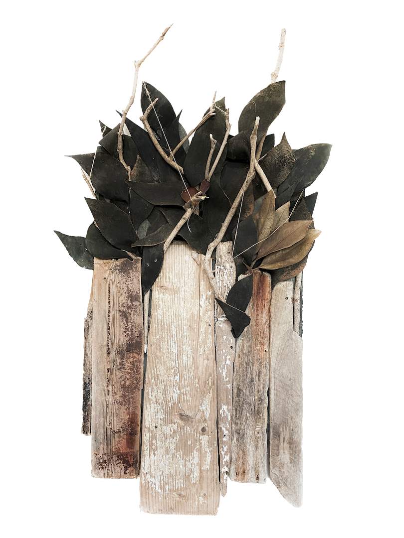 Installazione a parete: cuoio, olio, acrilico, legno di scarto, collage, elementi vegetali, spago,