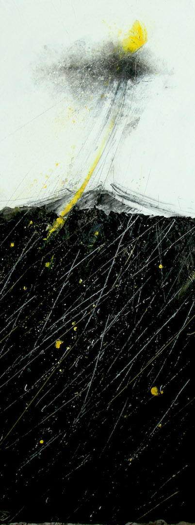 Tempera, olio, inchiostro di china, grafite, fusaggine, collage, filo di seta e di cotone, su cartongesso montato su telaio, cm 45 x 113 x 6.