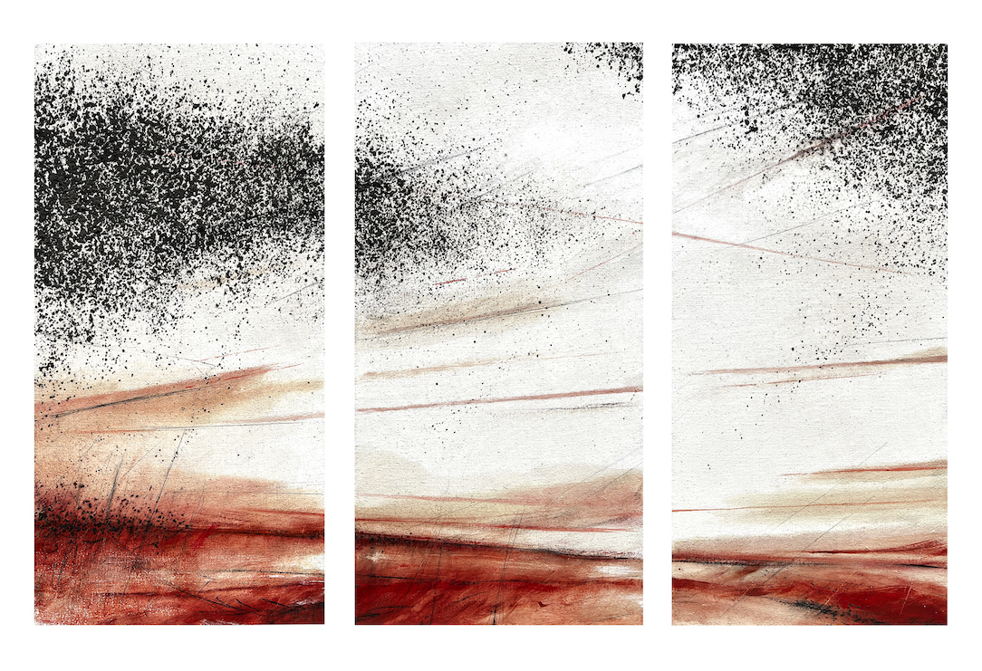 Olio, sabbia vulcanica, grafite e fusaggine su tela di juta, tre elementi, 60 x 120 cm ciascuno