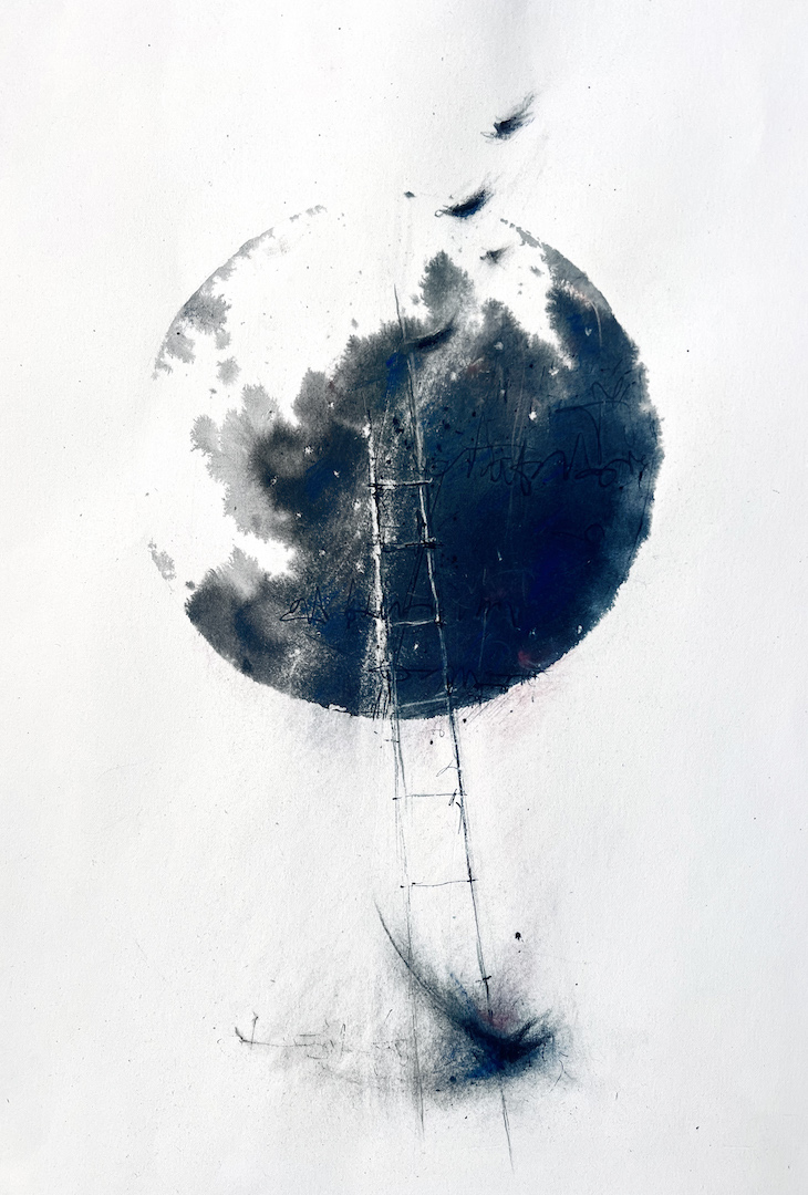 Inchiostro, penna, pastelli gessosi, matita e fusaggine su carta, 24 x 44 cm