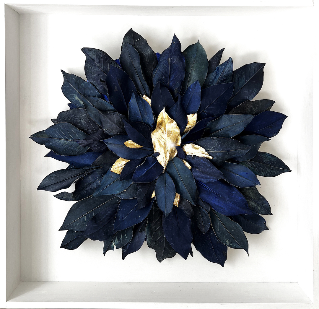 elementi naturali, carta, collage, acrilici, foglia oro 79 x 79 x 10 cm